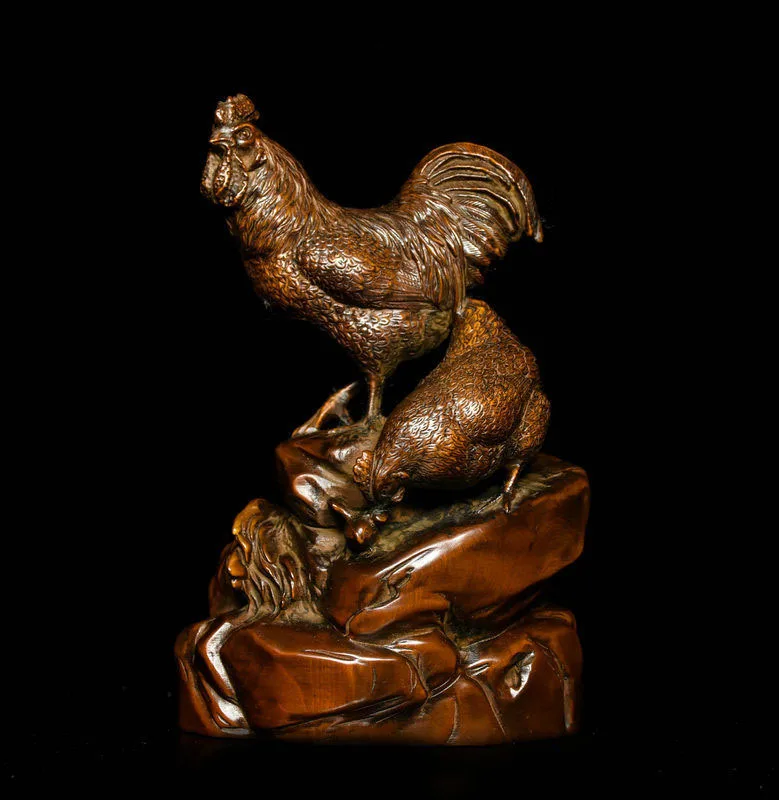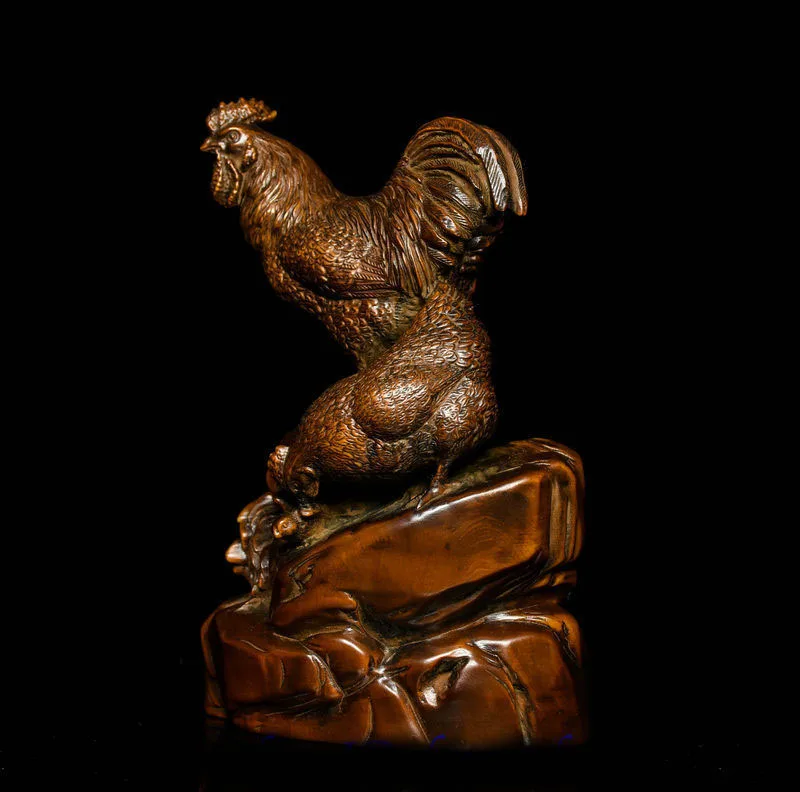 ORIGINAL wedding decoration Chinese Feng Shui Boxwood Wood Carving Zodiac Cock Rooster Happy Family Statue